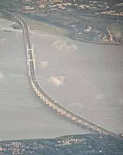 The chief architect of the bridge was Ronald Weeks of the Cardiff-based Percy Thomas Partnership, with the detailed engineering design by the Halcrow Group and the French consultancy SEEE.[12][13] The bridge has portals close to Sudbrook, Monmouthshire on the Welsh side and Severn Beach in South Gloucestershire on the English side. It has three principal sections – a 25 span viaduct on the English side of length 2,103 m (6,900 ft; 1.307 mi), a 24 span viaduct of length 2,077 m (6,814 ft; 1.291 mi) on the Welsh side and the bridge itself, a 948 m (3,110 ft; 0.589 mi) structure with a 37 m (121 ft) navigational clearance, giving a total length of 5,128 m (16,824 ft; 3.186 mi).[14][15][16] The central section, called the Shoots Bridge, is of cable-stayed design and the central span (between the bridge pylons) is 456 metres (1,496 ft) in length. The approach viaducts are of a segmental bridge design. The crossing forms a very slight reverse "S" curve – the roadway has an approximate east–west alignment at each of the portals, while the central bridge follows an alignment approximately WNW to ESE.