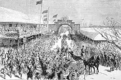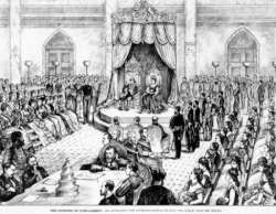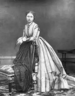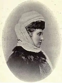 Louise's first few months in Canada were tinged with sadness as her favourite sister Alice, Grand Duchess of Hesse and by Rhine, died on 14 December 1878. Although homesick over that first Christmas, Louise soon grew accustomed to the winter climate. Sleighing and skating were two of her favourite pastimes. In Canada, as the monarch's direct representative, Lorne always took precedence over his wife, so that at the Opening of the Parliament of Canada on 13 February 1879, Louise was ranked no differently from others in attendance. She had to remain standing with the MPs, until Lorne asked them to be seated.[42] In order for Lorne to meet every Canadian member of Parliament, he held bi-weekly dinners for 50 people. However, some of the Canadian ladies responded negatively to the British party. One of her ladies-in-waiting reported that some had an "'I'm as good as you' sort of manner when one begins a conversation."[43] Court entertainments were open; anyone who could afford the clothing to attend functions was simply asked to sign the visitor's book.[44] Louise's first state ball was given on 19 February 1879, and she made a good impression on her guests when she ordered the silk cordon, separating the viceregal party from the guests, be removed. However, the ball was marred by various mishaps, including a drunken bandsman nearly starting a fire by pulling a curtain over a gas lamp.[44] The open house practice was criticized by guests who complained about the low social status of other guests. One attendee was horrified to find the attendee's grocer dancing in the same set.[44]