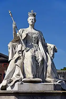 Louise was the most artistically talented of Queen Victoria's daughters and was a prolific artist and sculptor. When Louise sculpted a statue of the queen, portraying her in Coronation robes, the press claimed that her tutor, Sir Edgar Boehm, was the true creator of the work. The claim was denied by Louise's friends, who asserted her effort and independence.[108] The work was intended to be exhibited in 1887, but production was delayed until 1893. A memorial to her brother-in-law, Prince Henry of Battenberg, and a memorial to the colonial soldiers who fell during the Second Boer War, reside at Whippingham Church on the Isle of Wight, and another statue of Queen Victoria remains at McGill University in Montreal,[1] as well as the statue of Queen Victoria on the north side of Lichfield Cathedral.[109]