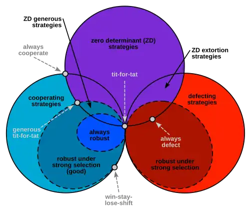 While extortionary ZD strategies are not stable in large populations, another ZD class called "generous" strategies is both stable and robust. When the population is not too small, these strategies can supplant any other ZD strategy and even perform well against a broad array of generic strategies for iterated prisoner's dilemma, including win–stay, lose–switch. This was proven specifically for the donation game by Alexander Stewart and Joshua Plotkin in 2013.[23] Generous strategies will cooperate with other cooperative players, and in the face of defection, the generous player loses more utility than its rival. Generous strategies are the intersection of ZD strategies and so-called "good" strategies, which were defined by Ethan Akin to be those for which the player responds to past mutual cooperation with future cooperation and splits expected payoffs equally if he receives at least the cooperative expected payoff.[24] Among good strategies, the generous (ZD) subset performs well when the population is not too small. If the population is very small, defection strategies tend to dominate.[23]