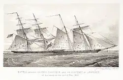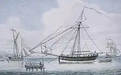 An American naval captain, ordered to take his ship out of Boston Harbor to eliminate a pair of Bermudian privateering vessels that had been picking off vessels missed by the Royal Navy, returned frustrated, saying, "the Bermudians sailed their ships two feet for every one of ours".[32] Around 10,000 Bermudians emigrated in the years prior to American independence, mostly to the American colonies. Many Bermudians occupied prominent positions in American seaports, from where they continued their maritime trades (Bermudian merchants controlled much of the trade through ports like Charleston, South Carolina, and Bermudian shipbuilders influenced the development of American vessels, like the Chesapeake Bay schooner),[28][33][34] and in the Revolution they used their knowledge of Bermudians and of Bermuda, as well as their vessels, for the rebels' cause. In the 1777 Battle of Wreck Hill, brothers Charles and Francis Morgan, members of a large Bermudian enclave that had dominated Charleston, South Carolina and its environs since settlement,[35][36] captaining two sloops (the Fair American and the Experiment, respectively), carried out the only attack on Bermuda during the war. The target was a fort that guarded a little used passage through the encompassing reef line. After the soldiers manning the fort were forced to abandon it, they spiked its guns and fled themselves before reinforcements could arrive.[37]