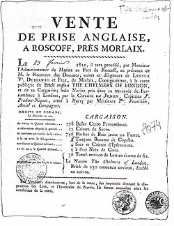 Advertising for the auction of the prize Chelmers of London, brig captured by the French privateer Junon in 1810.