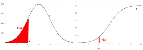 Continuous probability distributions can be described by means of the cumulative distribution function, which describes the probability that the random variable is no larger than a given value (i.e., P(X ≤ x) for some x. The cumulative distribution function is the area under the probability density function from -∞ to x, as shown in figure 1.[6]