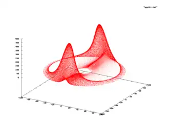 One example is shown in the figure to the right, which displays the evolution of a system of differential equations (commonly known as the Rabinovich–Fabrikant equations) that can be used to model the behaviour of Langmuir waves in plasma.[27] When this phenomenon is studied, the observed states from the subset are as indicated in red. So one could ask what is the probability of observing a state in a certain position of the red subset; if such a probability exists, it is called the probability measure of the system.[28][26]