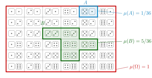 Probability space for throwing a die twice in succession: The sample space consists of all 36 possible outcomes; three different events (colored polygons) are shown, with their respective probabilities (assuming a discrete uniform distribution).