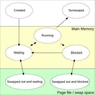 - ^ Stallings, William (2005). Operating Systems: internals and design principles (5th ed.). Prentice Hall. ISBN 0-13-127837-1. (particularly chapter 3, section 3.2, "process states", including figure 3.9 "process state transition with suspend states")