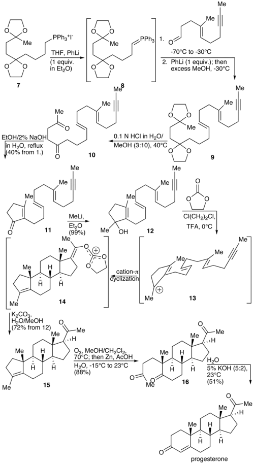 - ^ a b c Johnson WS, Gravestock MB, McCarry BE (August 1971). "Acetylenic bond participation in biogenetic-like olefinic cyclizations. II. Synthesis of dl-progesterone". Journal of the American Chemical Society. 93 (17): 4332–4334. Bibcode:1971JAChS..93.4332J. doi:10.1021/ja00746a062. PMID 5131151.