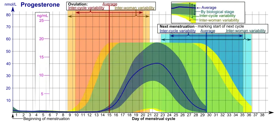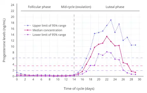 - ^ Stricker R, Eberhart R, Chevailler MC, Quinn FA, Bischof P, Stricker R (2006). "Establishment of detailed reference values for luteinizing hormone, follicle stimulating hormone, estradiol, and progesterone during different phases of the menstrual cycle on the Abbott ARCHITECT analyzer". Clinical Chemistry and Laboratory Medicine. 44 (7): 883–887. doi:10.1515/CCLM.2006.160. PMID 16776638. S2CID 524952.