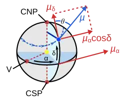 The components for proper motion in the equatorial coordinate system (of a given epoch, often J2000.0) are given in the direction of right ascension (μα) and of declination (μδ). Their combined value is computed as the total proper motion (μ).[3][4] It has dimensions of angle per time, typically arcseconds per year or milliarcseconds per year.