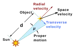 A year ago the object was d units of distance from the Sun, and its light moved in a year by angle μ radian/s. If there has been no distortion by gravitational lensing or otherwise then μ = where is the distance (usually expressed as annual velocity) transverse (tangential or perpendicular) to line of sight from the Sun. The angle is shaded light blue from the Sun to the object's start point and its year later position as if it had no radial velocity.