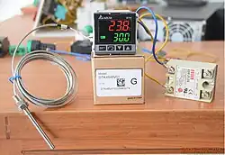 Typical setup for temperature controlling process. From left to right: resistance thermometer, Delta DTK4848V01 temperature controller with PID function, a solid-state relay