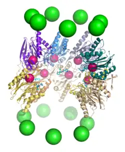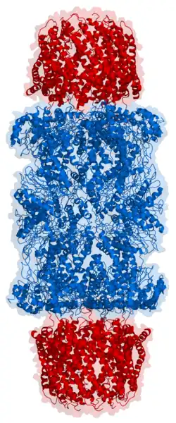 - ^ Groll M, Ditzel L, Löwe J, Stock D, Bochtler M, Bartunik HD, Huber R (April 1997). "Structure of 20S proteasome from yeast at 2.4 A resolution". Nature. 386 (6624): 463–71. Bibcode:1997Natur.386..463G. doi:10.1038/386463a0. PMID 9087403. S2CID 4261663.