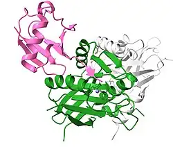 UCH37 is a Ubiquitin C-terminal hydrolase that activated upon binding the 26S proteasome through the ubiquitin receptor Rpn13.[90] UCH37 is activated upon binding the proteasome through the C-terminal DEUBAD (DUB adaptor) domain that binds Rpn2.[91][92]