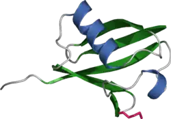 The ubiquitin protein itself is 76 amino acids long and was named due to its ubiquitous nature, as it has a highly conserved sequence and is found in all known eukaryotic organisms.[66] The genes encoding ubiquitin in eukaryotes are arranged in tandem repeats, possibly due to the heavy transcription demands on these genes to produce enough ubiquitin for the cell. It has been proposed that ubiquitin is the slowest-evolving protein identified to date.[67] Ubiquitin contains seven lysine residues to which another ubiquitin can be ligated, resulting in different types of polyubiquitin chains.[68] Chains in which each additional ubiquitin is linked to lysine 48 of the previous ubiquitin have a role in proteasome targeting, while other types of chains may be involved in other processes.[69][70]