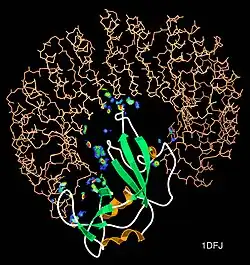 - ^ Kendrew JC, Bodo G, Dintzis HM, Parrish RG, Wyckoff H, Phillips DC (March 1958). "A three-dimensional model of the myoglobin molecule obtained by x-ray analysis". Nature. 181 (4610): 662–666. Bibcode:1958Natur.181..662K. doi:10.1038/181662a0. PMID 13517261. S2CID 4162786.