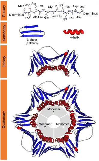 Protein structure is the three-dimensional arrangement of atoms in an amino acid-chain molecule. Proteins are polymers – specifically polypeptides – formed from sequences of amino acids, which are the monomers of the polymer. A single amino acid monomer may also be called a residue, which indicates a repeating unit of a polymer. Proteins form by amino acids undergoing condensation reactions, in which the amino acids lose one water molecule per reaction in order to attach to one another with a peptide bond. By convention, a chain under 30 amino acids is often identified as a peptide, rather than a protein.[1] To be able to perform their biological function, proteins fold into one or more specific spatial conformations driven by a number of non-covalent interactions, such as hydrogen bonding, ionic interactions, Van der Waals forces, and hydrophobic packing. To understand the functions of proteins at a molecular level, it is often necessary to determine their three-dimensional structure. This is the topic of the scientific field of structural biology, which employs techniques such as X-ray crystallography, NMR spectroscopy, cryo-electron microscopy (cryo-EM) and dual polarisation interferometry, to determine the structure of proteins.