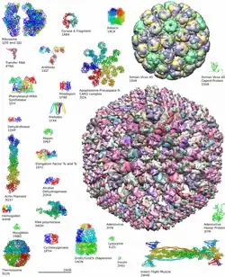 Around 90% of the protein structures available in the Protein Data Bank have been determined by X-ray crystallography.[28] This method allows one to measure the three-dimensional (3-D) density distribution of electrons in the protein, in the crystallized state, and thereby infer the 3-D coordinates of all the atoms to be determined to a certain resolution. Roughly 7% of the known protein structures have been obtained by nuclear magnetic resonance (NMR) techniques.[29] For larger protein complexes, cryo-electron microscopy can determine protein structures. The resolution is typically lower than that of X-ray crystallography, or NMR, but the maximum resolution is steadily increasing. This technique is still a particularly valuable for very large protein complexes such as virus coat proteins and amyloid fibers.