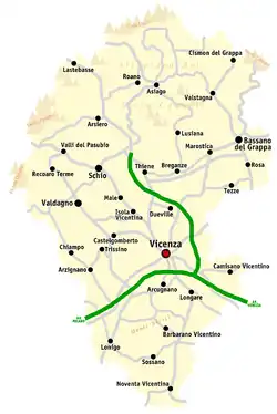 The province has an area of 2,723 km2, and a total population of 865,082 (as of 2017). There are 113 comuni (municipalities) in the province.[2] Towns in the province include Bassano del Grappa, Schio, Arzignano, Montecchio Maggiore, Thiene, Torri di Quartesolo, Noventa Vicentina, Marostica, Lonigo and Valdagno.