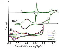 Prussian blue (PB) has been studied for its applications in electrochemical energy storage since 1978.[58] Prussian blue proper (the Fe-Fe solid) shows two well-defined reversible redox transitions in K+ solutions. Weakly solvated potassium ions (as well as Rb+ and Cs+, not shown) have the solvated radius, which fits the framework of Prussian Blue. On the other hand, the sizes of solvated Na+ and Li+ are too large for the PB cavity, and the intercalation of these ions is hindered and much slower. The low and high voltage sets of peaks in the cyclic voltammetry correspond to 1 and 2/3 electron per Fe atom, respectively.[59] The high voltage set is due to the Fe3+/Fe2+ transition at the low-spin Fe ions coordinated to C-atoms. The low-voltage set is due to high-spin Fe ion coordinated to N-atoms.[60][61][62]