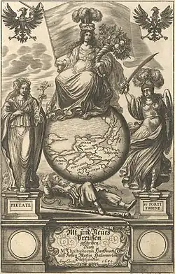 A non-contemporary illustration of Teutonic triumph in Prussia: a native Prussian man is crushed by the victorious Teutonic Knights (Christoph Hartknoch, 1684)