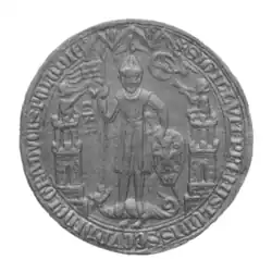Little is known about the origin and early years of Jakub Świnka, except for his mention in a document issued by Bolesław the Pious.[94][95] As Archbishop of Gniezno, the cooperation between him and Przemysł II was excellent. One example of this was that he appeared as witness in 14 diplomats[96] issued by the Duke of Greater Poland, including the confirmation of all his existing privileges and the permission to mint his own coins in Żnin and the castellany of Ląd.[97]