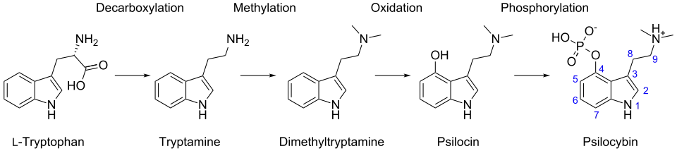 - ^ Agurell S, Nilsson JL (1968). "Biosynthesis of psilocybin. II. Incorporation of labelled tryptamine derivatives". Acta Chemica Scandinavica. 22 (4): 1210–1218. doi:10.3891/acta.chem.scand.22-1210. PMID 5750023.