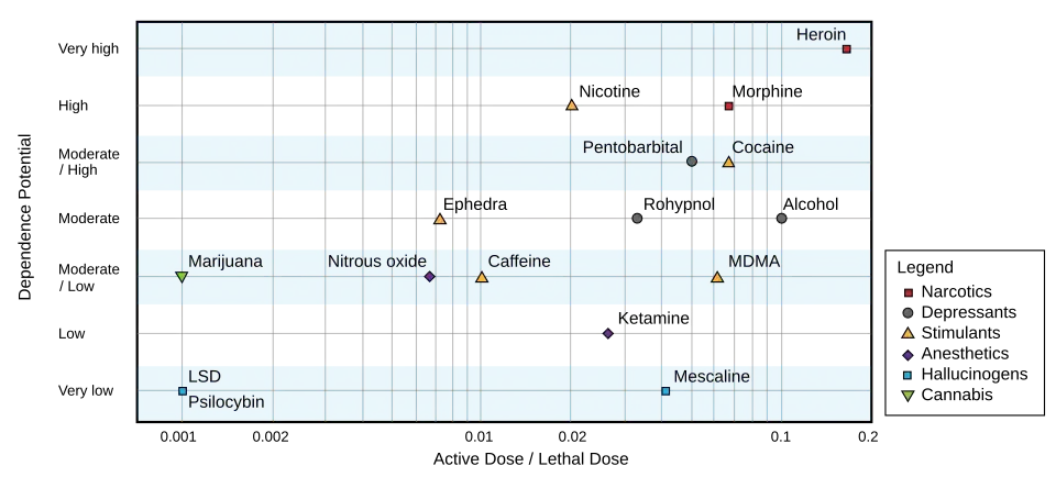 Repeated use of psilocybin does not lead to physical dependence.[2] A 2008 study concluded that, based on U.S. data from 2000 to 2002, adolescent-onset (defined here as ages 11–17) usage of hallucinogenic drugs (including psilocybin) did not increase the risk of drug dependence in adulthood; this was in contrast to adolescent usage of cannabis, cocaine, inhalants, anxiolytic medicines, and stimulants, all of which were associated with "an excess risk of developing clinical features associated with drug dependence".[3] Likewise, a 2010 Dutch study ranked the relative harm of psilocybin mushrooms compared to a selection of 19 recreational drugs, including alcohol, cannabis, cocaine, ecstasy, heroin, and tobacco. Psilocybin mushrooms were ranked as the illicit drug with the lowest harm,[4] corroborating conclusions reached earlier by expert groups in the United Kingdom.[5]