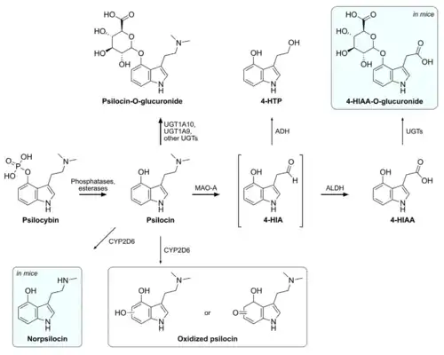| Metabolites | • Psilocin[11][10][7] • Psilocin-O-glucuronide[10][7] • 4-Hydroxyindole-3-acetaldehyde[10][7] • 4-Hydroxyindole-3-acetic acid (4-HIAA)[10][7] • 4-Hydroxytryptophol[10][7] |