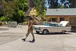 The Psycho set on the Universal Studios Lot, featuring a Ford Custom 300 similar to that driven by Janet Leigh in the film, is now part of the studio tour at the Universal Studios Hollywood theme park.