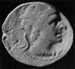 The date of Ptolemy XII's birth is thus uncertain.[17] If he was the son of Cleopatra IV, he was probably born around 117 BC and followed around a year later by a brother, known as Ptolemy of Cyprus. In 117 BC, Ptolemy IX was governor of Cyprus, but in 116 BC he returned to Alexandria upon the death of his father, Ptolemy VIII. At this point, Ptolemy IX became the junior co-regent of his grandmother Cleopatra II and his mother, Cleopatra III. In 115 BC, his mother forced him to divorce Cleopatra IV, who fled into exile. The former Egyptian queen married the Seleucid king Antiochus IX, but she was murdered by his half-brother and rival Antiochus VIII in 112 BC.[18][19][20] Ptolemy IX meanwhile had been remarried to Cleopatra Selene, with whom he had a daughter, Berenice III.[21] By 109 BC, Ptolemy IX had begun the process of introducing Ptolemy XII to public life. In that year, Ptolemy XII served as the Priest of Alexander and Ptolemaic kings (an office which Ptolemy IX otherwise held himself throughout his reign) and had a festival established in his honour in Cyrene.[22][23] Relations between Ptolemy IX and his mother deteriorated. In 107 BC she forced him to flee Alexandria for Cyprus and replaced him as co-regent with his younger brother, Ptolemy X.[21] Justin mentions that Ptolemy IX left two sons behind when he fled Alexandria.[24] Chris Bennett argues that these sons should be identified as Ptolemy XII and Ptolemy of Cyprus.[15]