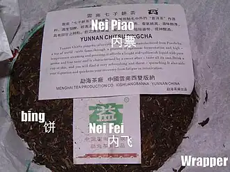 When bought in large quantities, pu'er tea is generally sold in stacks, referred to as a tǒng (), which are wrapped in bamboo shoot husks, bamboo stem husks, or coarse paper. Some tongs of vintage pu'er will contain a tǒng piào (), or tong ticket, but it is less common to find them in productions past the year 2000.[12] The number of bǐngchá in a tǒng varies depending on the weight of individual bǐngchá. For instance one tǒng can contain: