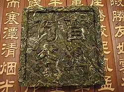 Square Fāngchá A flat square of tea, usually in 100 g or 200 g sizes. Characters are often pressed into the square, as in the example illustrated.