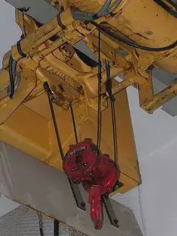 A hoist using the compound pulley system yielding an advantage of 4. The single fixed pulley is installed on the hoist. The two movable pulleys (joined) are attached to the hook. One end of the rope is attached to the crane frame, another to the winch.
