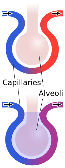 Normally, the ratio of ventilation to perfusion is about one-to-one; the volume of air entering the alveoli (ventilation) is about equal to that of blood in the capillaries around them (perfusion).[45] This ratio is reduced in pulmonary contusion; fluid-filled alveoli cannot fill with air, oxygen does not fully saturate the hemoglobin, and the blood leaves the lung without being fully oxygenated.[46] Insufficient inflation of the lungs, which can result from inadequate mechanical ventilation or an associated injury such as flail chest, can also contribute to the ventilation/perfusion mismatch.[35] As the mismatch between ventilation and perfusion grows, blood oxygen saturation is reduced.[46] Pulmonary hypoxic vasoconstriction, in which blood vessels near the hypoxic alveoli constrict (narrow their diameter) in response to the lowered oxygen levels, can occur in pulmonary contusion.[31] The vascular resistance increases in the contused part of the lung, leading to a decrease in the amount of blood that flows into it,[43] directing blood to better-ventilated areas.[31] Although reducing blood flow to the unventilated alveoli is a way to compensate for the fact that blood passing unventilated alveoli is not oxygenated,[31] the oxygenation of the blood remains lower than normal.[45] If it is severe enough, the hypoxemia resulting from fluid in the alveoli cannot be corrected just by giving supplemental oxygen; this problem is the cause of a large portion of the fatalities that result from trauma.[46]