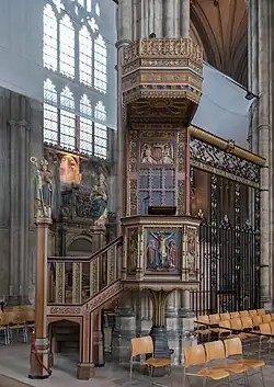 A pulpit is a raised stand for preachers in a Christian church. The origin of the word is the Latin pulpitum (platform or staging).[1] The traditional pulpit is raised well above the surrounding floor for audibility and visibility, accessed by steps, with sides coming to about waist height. From the late medieval period onwards, pulpits have often had a canopy known as the sounding board, tester or abat-voix above and sometimes also behind the speaker, normally in wood.[2] Though sometimes highly decorated, this is not purely decorative, but can have a useful acoustic effect in projecting the preacher's voice to the congregation below, especially prior to the invention of modern audio equipment. Most pulpits have one or more book-stands for the preacher to rest his bible, notes or texts upon.