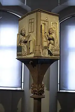 In the Reformed tradition, though avoiding figurative art, pulpits were increasingly important as a focus for the church, with the sanctuary now comparatively bare and de-emphasized, and were often larger and more elaborately decorated than in medieval churches.[17]