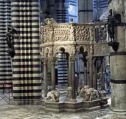 Large raised pulpits, elaborately carved with relief panels, were important monuments in the Italian Duecento, with the best known including those of the Pisa Baptistery (dated 1260) and Siena Cathedral Pulpit by Nicola Pisano and the Pulpit of Sant' Andrea, Pistoia, by his son Giovanni Pisano (1297–1301).