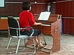 The pump organ or reed organ is a type of organ that uses free reeds to generate sound, with air passing over vibrating thin metal strips mounted in a frame. Types include the pressure-based harmonium, the suction reed organ (which employs a vacuum system), and the Indian harmonium. Historical examples include the Kunstharmonium and the American reed organ, while earlier forms include the physharmonica and the seraphine.[1]