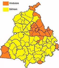 Punjab (/pʌnˈɑːb/ pun-JAHB;[8] Punjabi: pañjāba, pronounced [pəɲˈd͡ʒaːb] ) is a state in northwestern India. Forming part of the larger Punjab region of the Indian subcontinent, the state is bordered by the Indian states of Himachal Pradesh to the north and northeast, Haryana to the south and southeast, and Rajasthan to the southwest; by Indian-administered Jammu and Kashmir to the north and Chandigarh to the east. To the west, it shares an international border with the identically named Pakistani province of Punjab, and as such is sometimes referred to as East Punjab or Indian Punjab for disambiguation purposes.[9] The state covers an area of 50,362 square kilometres (19,445 square miles), which is 1.53% of India's total geographical area,[10] making it the 19th-largest Indian state by area out of 28 Indian states (20th largest, if Union Territories are considered). With over 27 million inhabitants, Punjab is the 16th-largest Indian state by population, comprising 23 districts.[11] Punjabi, written in the Gurmukhi script, is the most widely spoken and the official language of the state.[12] The main ethnic group are the Punjabis, with Sikhs (57.7%) and Hindus (38.5%) forming the dominant religious groups.[13] The state capital, Chandigarh, is a union territory and also the capital of the neighboring state of Haryana. Three of the five traditional Punjab rivers — the Sutlej, Beas, and Ravi — flow through the state.[14]