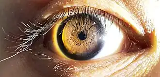 One explanation for the evolution of slit pupils is that they can exclude light more effectively than a circular pupil.[39][40] This would explain why slit pupils tend to be found in the eyes of animals with a crepuscular or nocturnal lifestyle that need to protect their eyes during daylight. Constriction of a circular pupil (by a ring-shaped muscle) is less complete than closure of a slit pupil, which uses two additional muscles that laterally compress the pupil.[41] For example, the cat's slit pupil can change the light intensity on the retina 135-fold compared to 10-fold in humans.[42] However, this explanation does not account for circular pupils that can be closed to a very small size (e.g., 0.5 mm in the tarsier) and the rectangular pupils of many ungulates which do not close to a narrow slit in bright light.[43] An alternative explanation is that a partially constricted circular pupil shades the peripheral zones of the lens which would lead to poorly focused images at relevant wavelengths. The vertical slit pupil allows for use of all wavelengths across the full diameter of the lens, even in bright light.[4] It has also been suggested that in ambush predators such as some snakes, vertical slit pupils may aid in camouflage, breaking up the circular outline of the eye.[44]