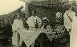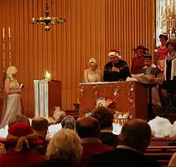 Women have an obligation to hear the Megillah because "they also were involved in that miracle."[58] Orthodox communities, including most Modern Orthodox ones, however, generally do not allow women to lead the Megillah reading. Rabbinic authorities who hold that women should not read the Megillah for themselves, because of an uncertainty as to which blessing they should recite upon the reading, nonetheless agree that they have an obligation to hear it read. According to these authorities if women, or men for that matter, cannot attend the services in the synagogue, the Megillah should be read for them in private by any male over the age of thirteen.[59] Often in Orthodox communities there is a special public reading only for women, conducted either in a private home or in a synagogue, but the Megillah is read by a man.[60]
