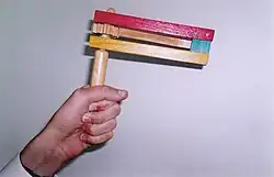 When Haman's name is read out loud during the public chanting of the Megillah in the synagogue, which occurs 54 times, the congregation engages in noise-making to blot out his name. The practice can be traced back to the Tosafists (the leading French and German rabbis of the 13th century). In accordance with a passage in the Midrash, where the verse "Thou shalt blot out the remembrance of Amalek"[62] is explained to mean "even from wood and stones." A custom developed of writing the name of Haman, the offspring of Amalek, on two smooth stones, and knocking them together until the name was blotted out. Some wrote the name of Haman on the soles of their shoes, and at the mention of the name stamped with their feet as a sign of contempt. Another method was to use a noisy ratchet, called a ra'ashan (from the Hebrew ra-ash, meaning "noise") and in Yiddish a grager. Some of the rabbis protested against these uproarious excesses, considering them a disturbance of public worship, but the custom of using a ratchet in the synagogue on Purim is now almost universal, with the exception of Spanish and Portuguese Jews and other Sephardic Jews, who consider them an improper interruption of the reading.[63] The great Ashkenazi halachic authority, Rabbi Moshe Isserles, affirmed and validated this custom in his notes on the Shulchan Aruch: