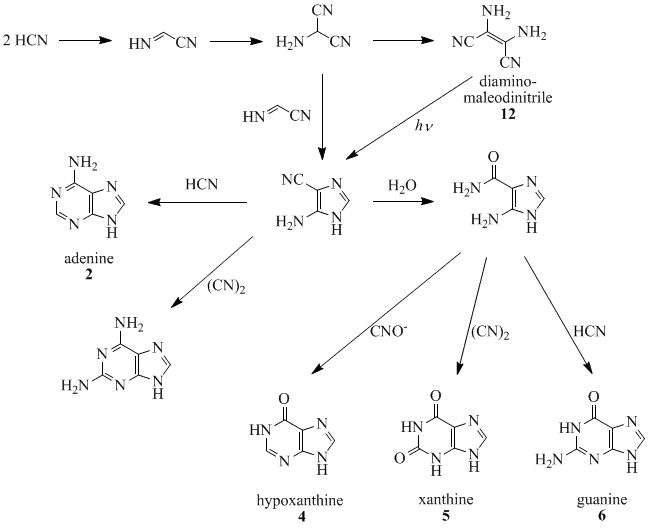 Oro and Kamat (1961) and Orgel co-workers (1966, 1967) have shown that four molecules of HCN tetramerize to form diaminomaleodinitrile (12), which can be converted into almost all naturally occurring purines.[18][19][20][21][22] For example, five molecules of HCN condense in an exothermic reaction to make adenine, especially in the presence of ammonia.