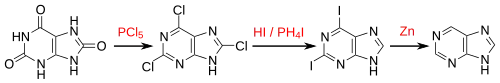 Conversion of uric acid (left) to purine (right) via 2,6,8-trichloropurine and 2,6-diiodopurine intermediates