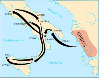Pyrrhus entered Italy with an army consisting of 20,000 infantry, 3,000 cavalry, 2,000 archers, 500 slingers, and 20 war elephants in a bid to subdue the Romans.[6] The elephants had been loaned to him by Ptolemy II Philadelphus, who had also promised 9,000 soldiers and a further 50 elephants to defend Epirus while Pyrrhus and his army were away.
