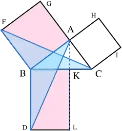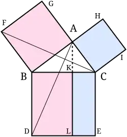 This proof, which appears in Euclid's Elements as that of Proposition 47 in Book 1, demonstrates that the area of the square on the hypotenuse is the sum of the areas of the other two squares.[37][38] This is quite distinct from the proof by similarity of triangles, which is conjectured to be the proof that Pythagoras used.[39][b]