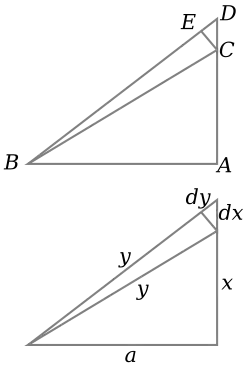 If x is increased by a small amount dx by extending the side AC slightly to D, then y also increases by dy. These form two sides of a triangle, CDE, which (with E chosen so CE is perpendicular to the hypotenuse) is a right triangle approximately similar to ABC. Therefore, the ratios of their sides must be the same, that is: This can be rewritten as y dy = x dx, which is a differential equation that can be solved by direct integration: giving The constant can be deduced from x = 0, y = a to give the equation This is more of an intuitive proof than a formal one: it can be made more rigorous if proper limits are used in place of dx and dy.