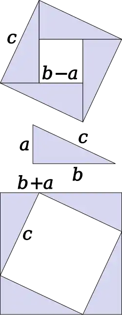 A similar proof uses four copies of a right triangle with sides a, b and c, arranged inside a square with side c as in the top half of the diagram.[31] The triangles are similar with area 1/2ab, while the small square has side ba and area (ba)2. The area of the large square is therefore