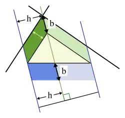 As shown in the accompanying animation, area-preserving shear mappings and translations can transform the squares on the sides adjacent to the right-angle onto the square on the hypotenuse, together covering it exactly.[42] Each shear leaves the base and height unchanged, thus leaving the area unchanged too. The translations also leave the area unchanged, as they do not alter the shapes at all. Each square is first sheared into a parallelogram, and then into a rectangle which can be translated onto one section of the square on the hypotenuse.