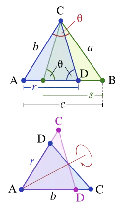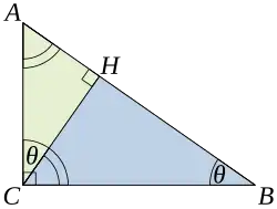 Let ABC represent a right triangle, with the right angle located at C, as shown on the figure. Draw the altitude from point C, and call H its intersection with the side AB. Point H divides the length of the hypotenuse c into parts d and e. The new triangle, ACH, is similar to triangle ABC, because they both have a right angle (by definition of the altitude), and they share the angle at A, meaning that the third angle will be the same in both triangles as well, marked as θ in the figure. By a similar reasoning, the triangle CBH is also similar to ABC. The proof of similarity of the triangles requires the triangle postulate: The sum of the angles in a triangle is two right angles, and is equivalent to the parallel postulate. Similarity of the triangles leads to the equality of ratios of corresponding sides:
